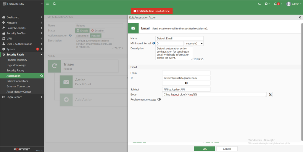 Automation: Cihazın belirli durumlarda bildirim göndermesini sağladığımız yer. HA Failover, Reboot gibi cihazımızda eğer değişiklikler gerçekleşirse, girişlerde yanlış parola girilmesi, fiziksel cihazımızın sıcaklığının artması, lisans süremizin dolması vb. pek çok durumda bize mail gönderir. CLI Script bölümünün bulunması bize ekstra güvenlik sağlayabilir bazı günlük haftalık olarak çalıştıracağımız komutlarım automation kısmıyla otomatik olarak çalıştırabiliriz.