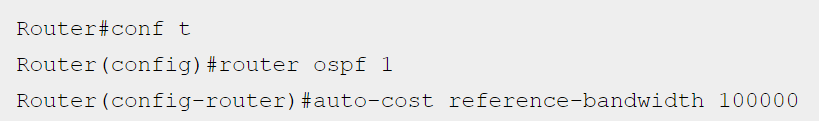 - OSPF’de referans bant genişliğini değiştirme işlemi Şekil 3’ teki gibi yapılır. Auto-coast referance-bandwith komutu, referans alınan bant genişliği değerini belirler. Bir cihazda değişirse tüm cihazlarda değişmesi gerekmektedir. “Cost = 100Mb / bw” değeri ile defaultda hesaplanır. Referans değerini değiştirmek istersek buradaki 100Mb değerini değiştirmiş oluruz. Örneğin 100Mb bağlantı hızınız varsa “Cost = 100Mb / 100 = 1Mb” dir. Bağlantı hızınız 1000Mb olsa da “100/1000 = 0.1” olur fakat OSPF yalnızcatam sayı (integer) cost değeri kabul ettiğinden 1 alınır. Bu durumda 100 ve 1000Mb bağlantı değerleri OSPF tarafından eşit değerlendirilmiş olur. Bu durumun önüne geçebilmek için referans değeri değiştirilir.