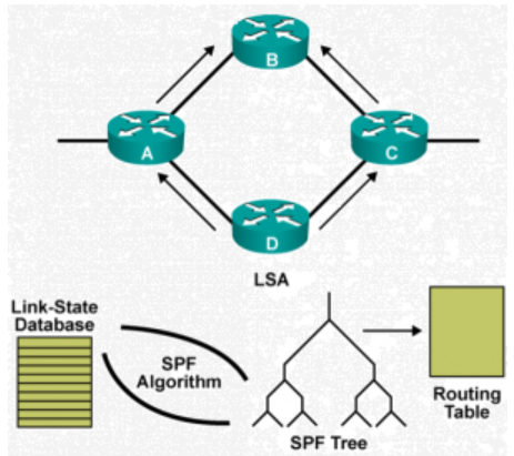 OSPF protokolünde, hello paketlerine gelen cevaplara göre LSA paketlerinin iletimi başlar. LSA paketlerinin içeriğinde yönlendiricilerin bağlantıları, arayüz bilgileri ve hat durumu gibi bilgiler yer alır. Bu paket alışverişi sonucunda her yönlendirici kendisine ait bir LSA tablosu oluşturur. Oluşan bu tablo, diğer yönlendiricilere gönderilerek tüm yönlendiricilerin birbirlerinin LSA bilgilerini öğrendiği LSDB (Link-State Database) yani hat durumu veritabanı meydana gelir. LSDB veritabanı, hedef ağa ulaşmak için en uygun yolu belirlemek amacıyla kullanılır.